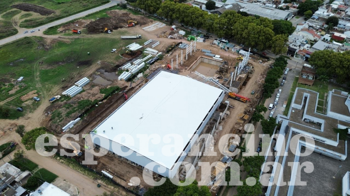La obra tiene un avance del 60 % y comenzó la instalación de la pileta de nado, sector que ya se encuentra casi cerrado en su totalidad. Bajo esta gran nave central, se hormigonaron los tabiques del sector norte, correspondiente a sectores de servicios, oficinas y sanitarios; y comenzaron las tareas de excavación y hormigonado de cimientos y tabiques en el sector sur, correspondiente a vestuarios.