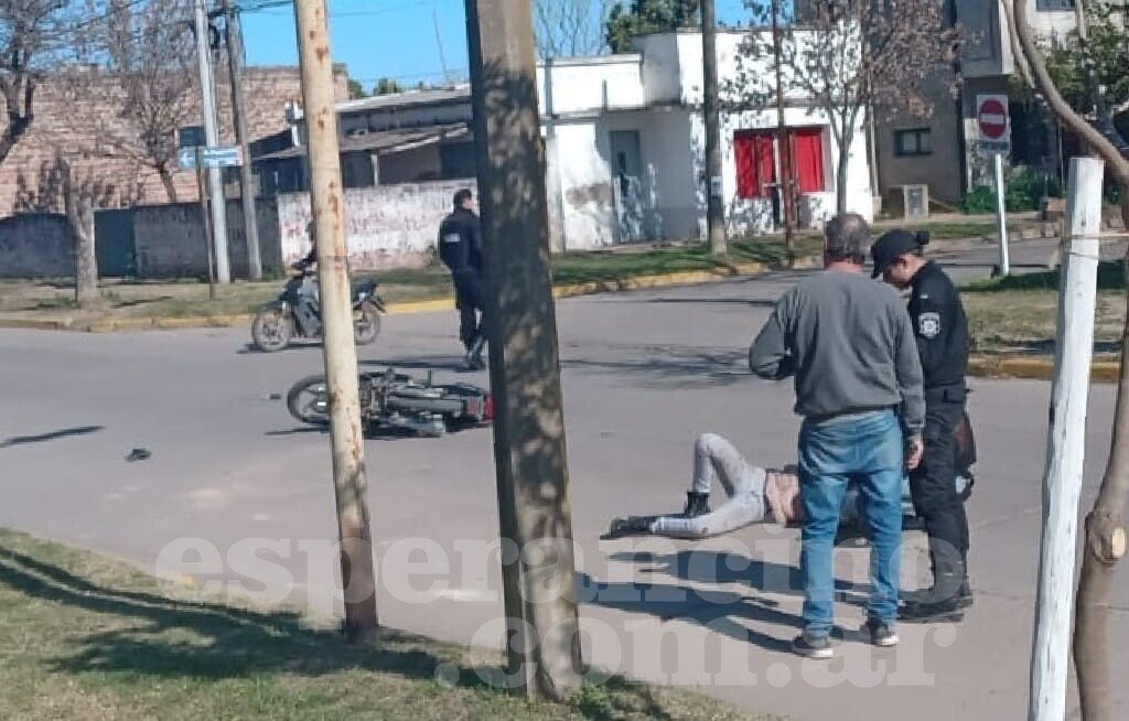 Una joven que circulaba en motocicleta impactó con un auto en la esquina de Pueyrredón y 1° de Mayo, frente